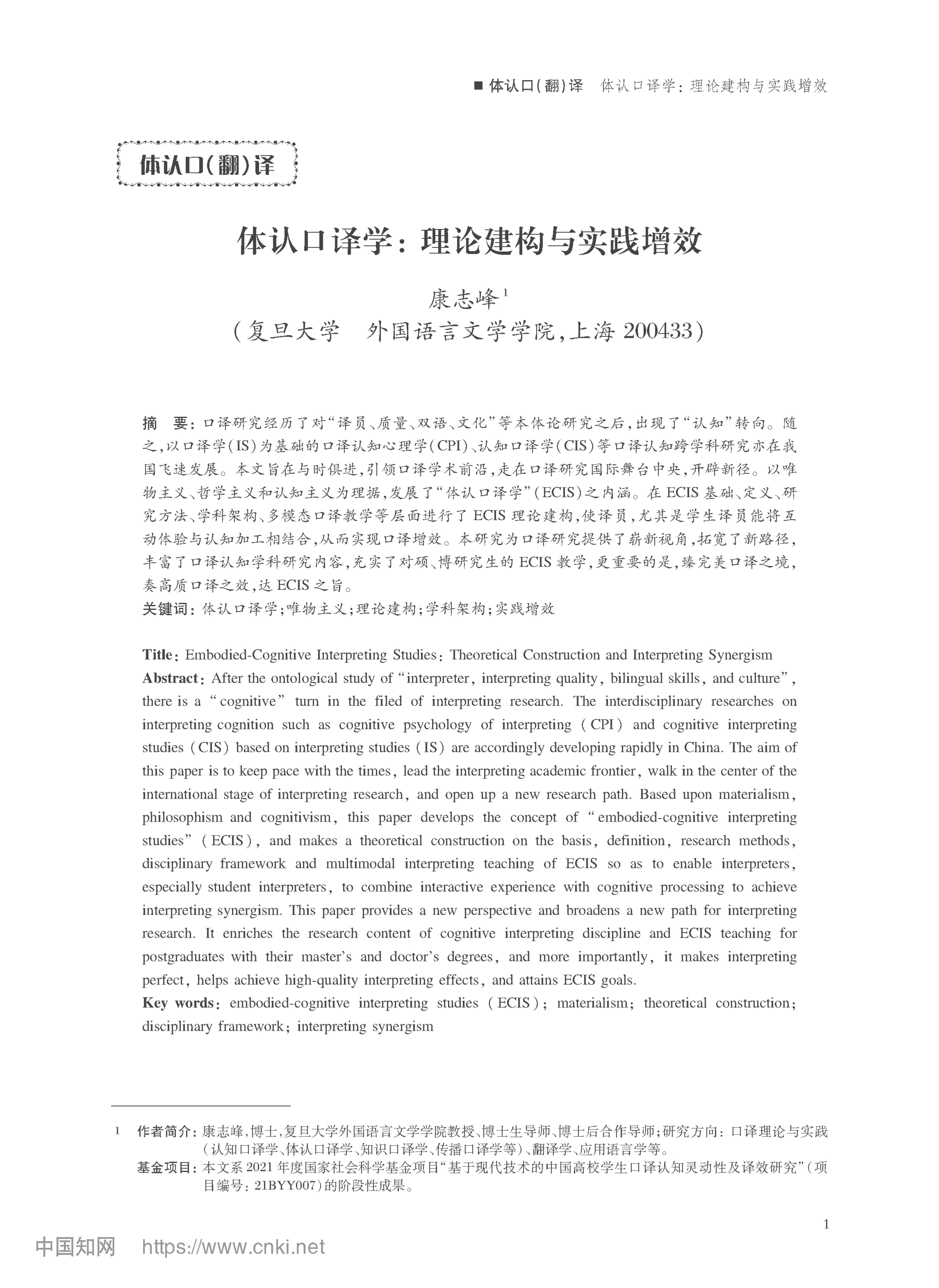 体认口译学:理论建构与实践增效 康志峰